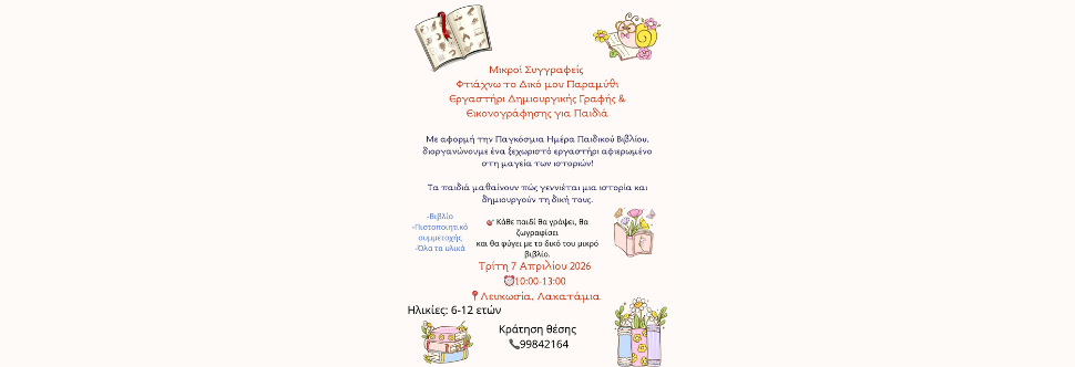 Με αφορμή την Παγκόσμια Ημέρα Παιδικού Βιβλίου, δημιουργούμε ένα ξεχωριστό εργαστήρι γεμάτο φαντασία, λέξεις και εικόνες! 📚✨ Στο «Μικροί Συγγραφείς – Φτιάχνω το Δικό μου Παραμύθι» τα παιδιά θα μάθουν […]